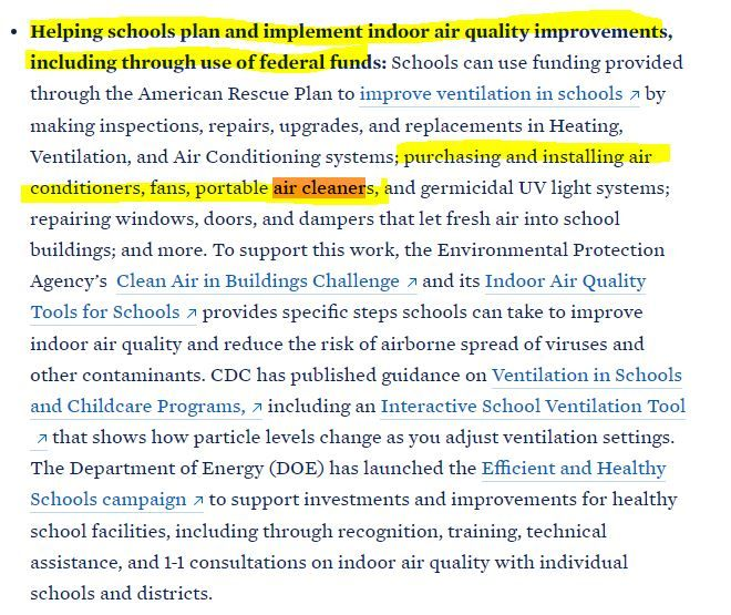 Helping schools plan and implement indoor air quality improvements, including through use of federal funds: Schools can use funding provided through the American Rescue Plan to improve ventilation in schools a by making inspections, repairs, upgrades, and replacements in Heating, Ventilation, and Air Conditioning systems; purchasing and installing air conditioners, fans, portable air cleaners, and germicidal UV light systems;repairing windows, doors, and dampers that let fresh air into school buildings; and more. To support this work, the Environmental Protection Agency’s Clean Air in Buildings Challenge a and its Indoor Air Quality Tools for Schools a provides specific steps schools can take to improve indoor air quality and reduce the risk of airborne spread of viruses and other contaminants. CDC has published guidance on Ventilation in Schools and Childcare Programs, a including an Interactive School Ventilation Tool that shows how particle levels change as you adjust ventilation settings. The Department of Energy (DOE) has launched the Efficient and Healthy Schools campaign a to support investments and improvements for healthy school facilities, including through recognition, training, technical assistance, and 1-1 consultations on indoor air quality with individual schools and districts.